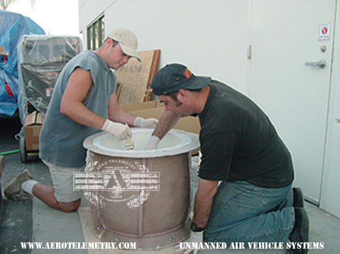 Aero Telemetry used a 360cc 30 hp, twin cylinder, air-cooled two-stroke engine to power the H1 Racer replica. John and Roger also fabricated a special exhaust system and modified the carburetor to squeeze more power from it. Due to the weight of the plane, the first engine chosen for the model was entirely too small and had to removed and replaced over the weekend before the airplanes first flight. For the first flight the propeller was a 3-blade, fixed pitch, 48 inch "Ivo-Prop" Propeller that had to be cut down slightly due to ground clearance issues. It over-ran on the engine during the first flight at El Mirage and although it successfully flew the Hughes H1 Racer it was replaced after the flight with an in-flight adjustable, variable pitch propeller of 48 inches in diameter. This proved to be the perfect fit and the Aero Telemetry H1 Racer really flew like the real one. Fast, loud, big, and beautiful...that was the H1 Racer flown for filming the aerial sequences for the movie The Aviator on November 17th, 2003 by the Aero Telemetry Team.